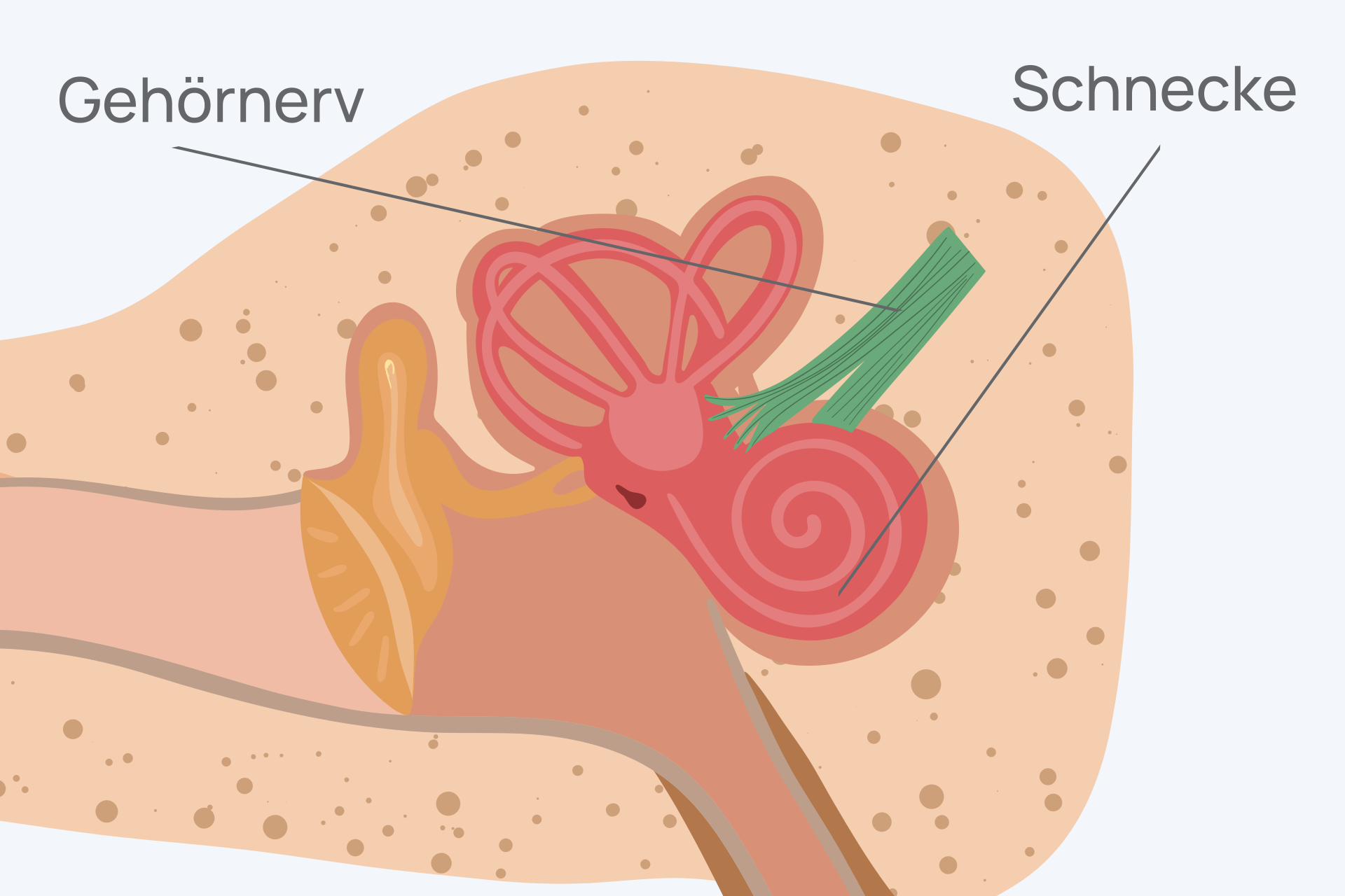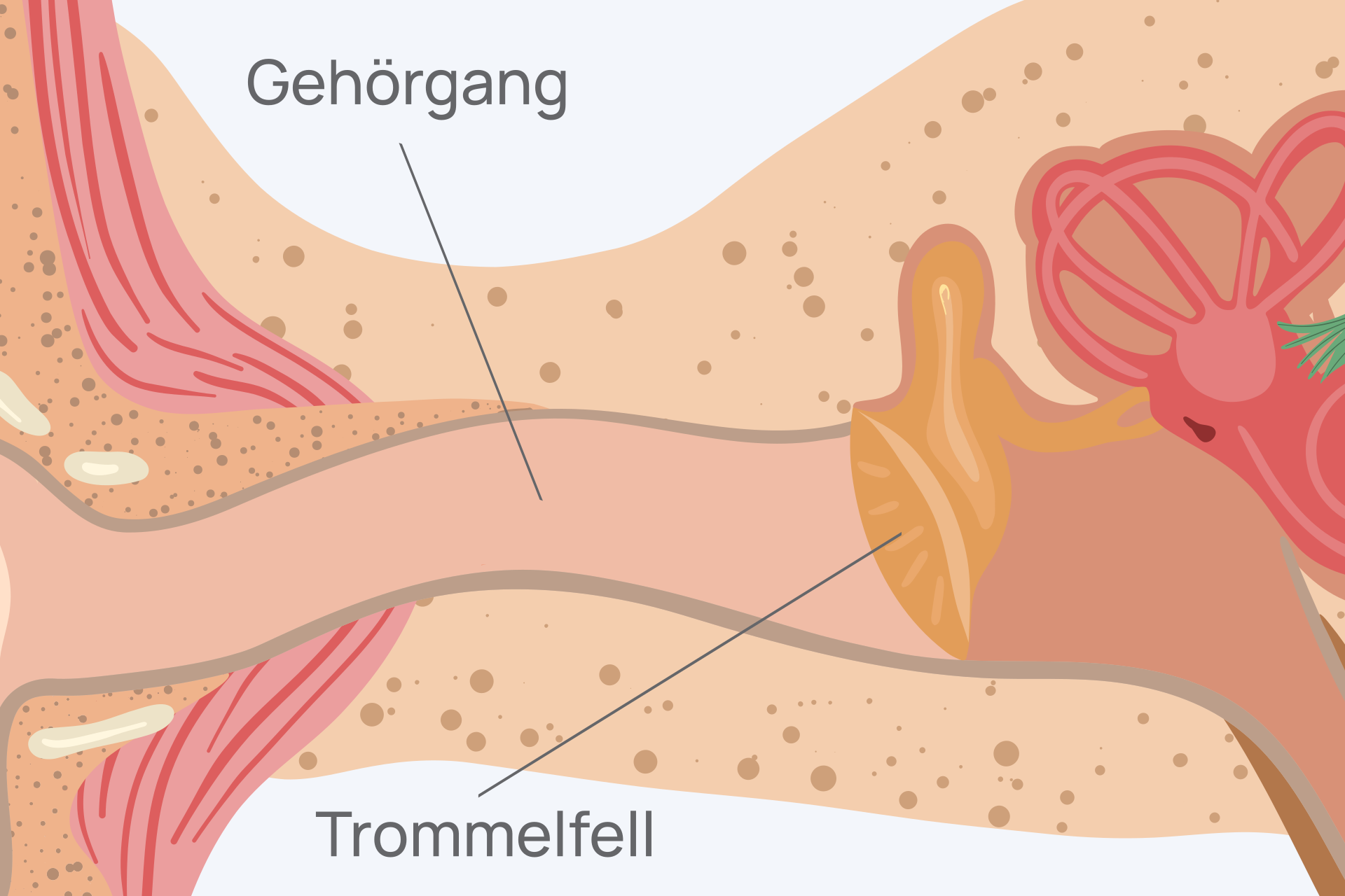 Das äußere Ohr mit der Ohrmuschel wirkt wie ein natürlicher Schalltrichter. Es sammelt die Schallwellen, bündelt sie und leitet sie gezielt in den äußeren Gehörgang. Durch seine Form hilft die Ohrmuschel zudem dabei, Geräusche räumlich einzuordnen – wir können also erkennen, ob ein Laut von vorn, hinten oder von der Seite kommt.